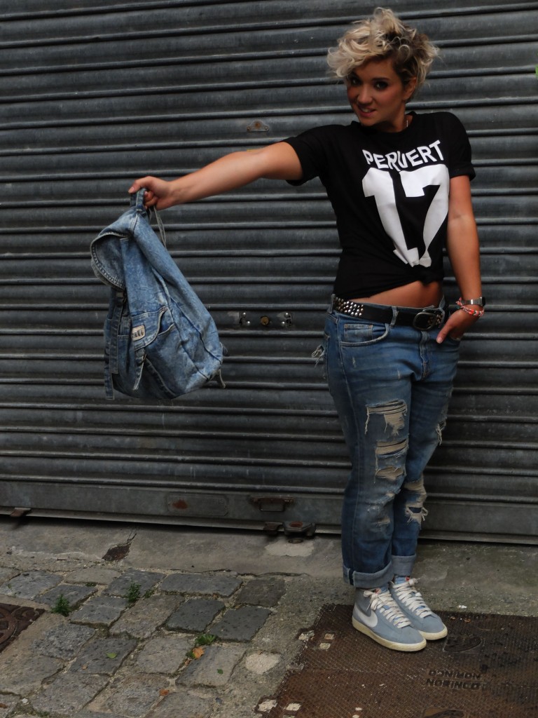 Boyfriend ZARA – TeeShirt Japon Harajuku – Ceinture PIMKIE – Sac à dos Jeans 80’s (chiné) – Montre CASIO – Baskets Nike SPARTOO.